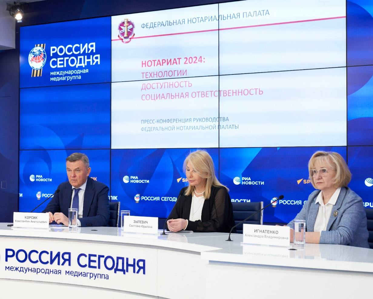 Важной темой пресс-конференции стало развитие цифрового нотариата, которому этим летом исполнится уже 10 лет. «Мы разработали и создали эту уникальную систему целиком и полностью по нашей инициативе и на средства нотариата, и все последующее развитие цифровых технологий в нотариате и во многом в правовой сфере в целом основано на ней», — отметил Константин Корсик.